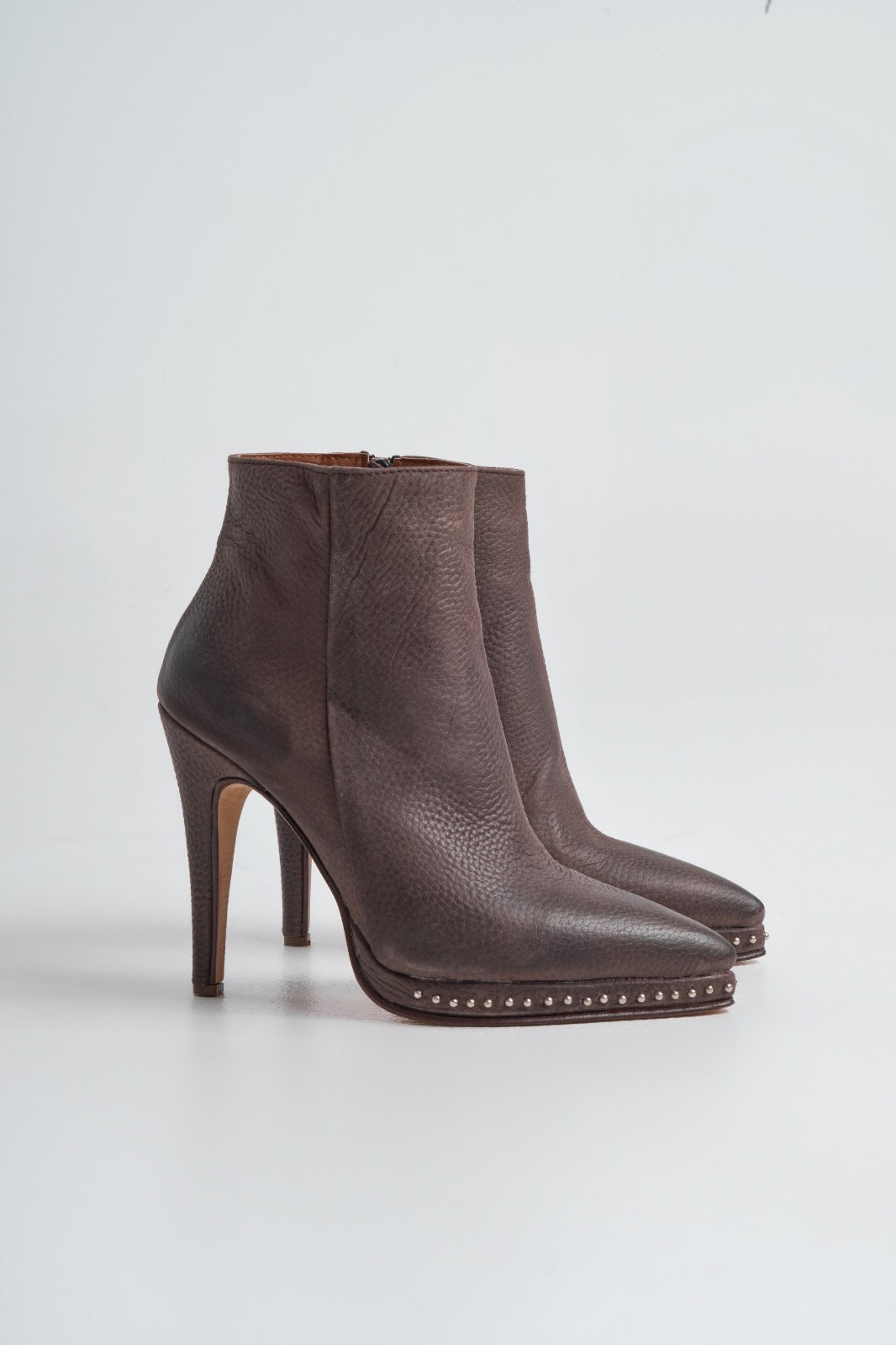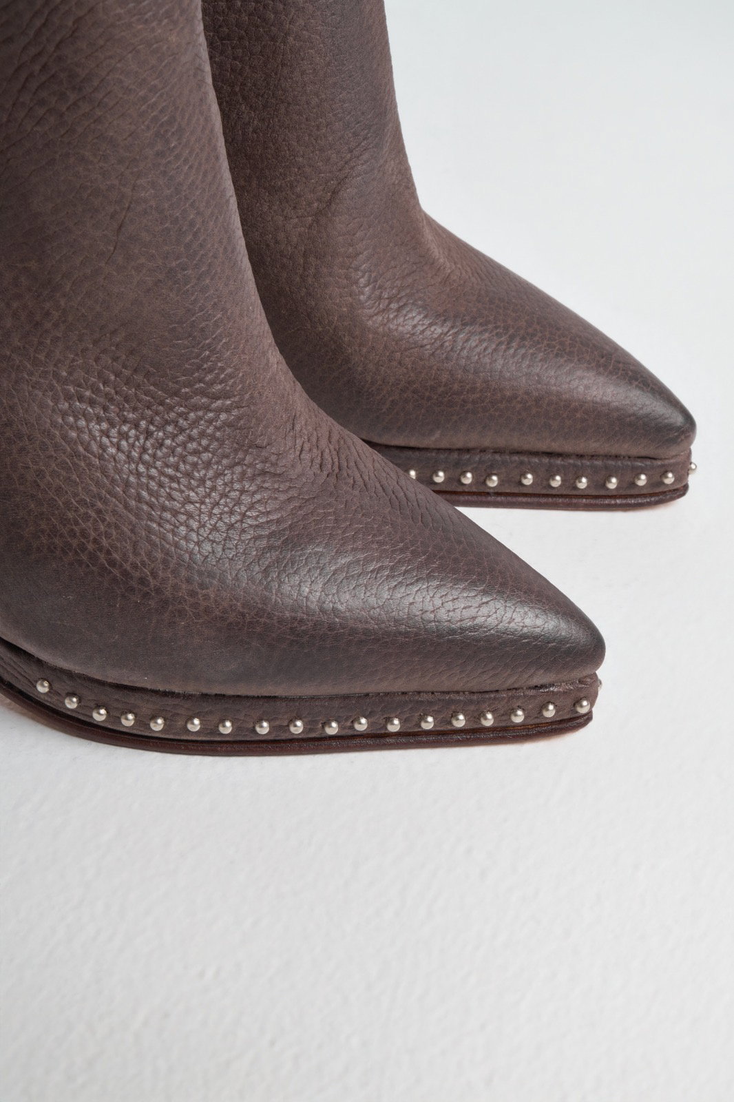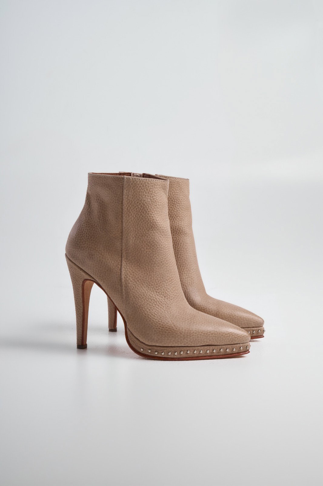 Botas Charo Material: Cuero Altura de taco: 10,5 cm Altura deplataforma:1,5 cm Altura de caña:16cm Horma: Normal Detalle:Cuero graneado, tachas en plataforma Disponible: 36 al 40