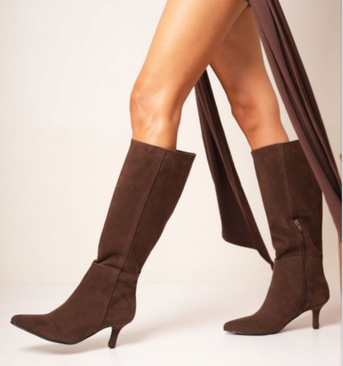 Botas largas con cierre lateral taco chupete material cuero Pu de 4 cm punta fina en color chocolate y negro del 35 al 40